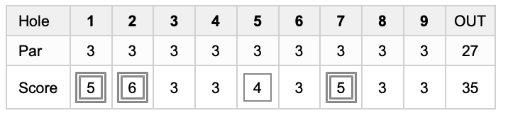 Today I played a short par 3. I played 9 holes and it was 680 yards in total. I didn’t start off very well. I couldn’t get my distances right because it wasn’t a full swing distance. I also hit the wrong club once on accident :(. I was happy about I recovered from a bad start. After the first two holes, I was 5 over par, but played the next 7 holes 3 over par – so, that’s good. My chipping was good, but putting was rough – I just couldn’t get the speed right because the greens were so slow. I got 3rd place, which I’m happy with, and I beat my sister by 1 stroke, which I’m even happier about!